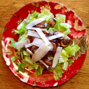 Carefully portion the mushrooms over the plates of romaine.