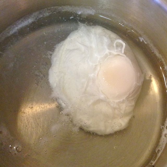 Using a spoon gently encourage the outlying eggwhites to stay close to the main egg. Pour a bit of the water over the yolks just to be sure they’ve got a bit of a skin on them.