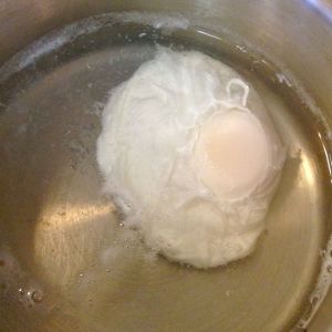 (If you need to do more than 4 or 5 eggs, simply cook them in batches, hold the cooked ones in cold water, return to simmering water for 1 minute to reheat. You can even do eggs before hand, and keep them covered with water in the fridge for up to a day and reheat when needed.)
