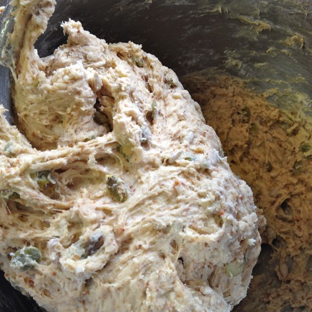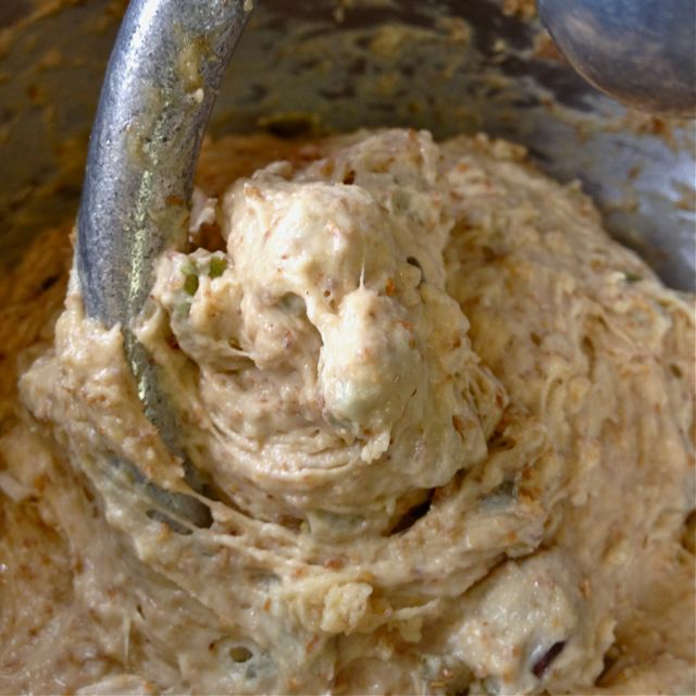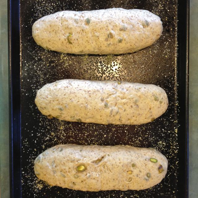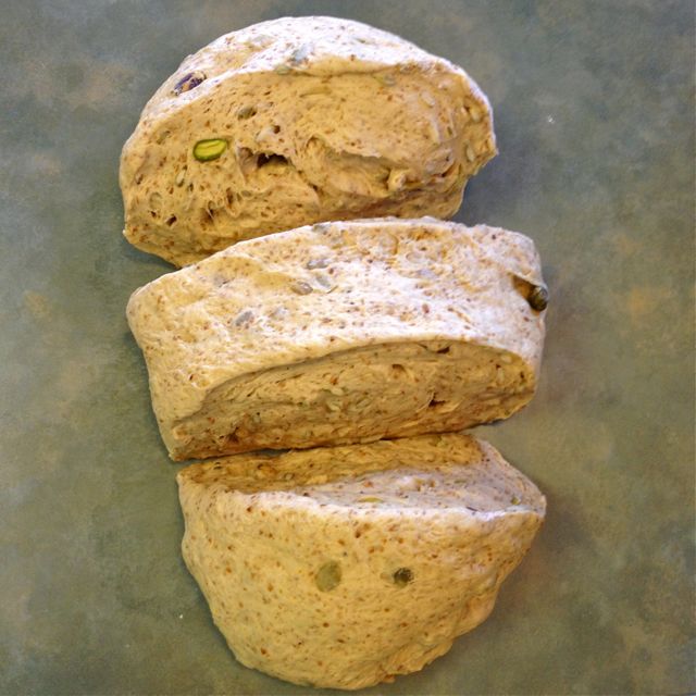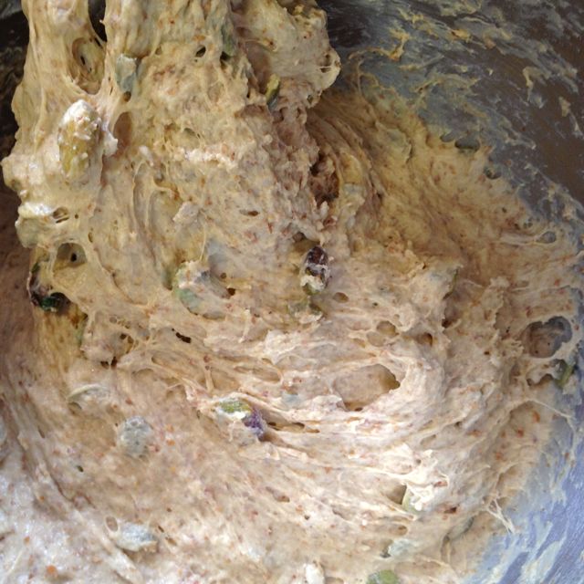 I could probably make this with my eyes closed. In fact I may well have! This is a simple bread recipe that lends itself to many different additions. I’ve made it for weddings, fund-raisers and just for the family. When I’m catering, I use one loaf for 8 guests, and rarely have any leftovers. I use my Kitchen Aid mixer with the dough hook, but there’s no reason you can’t make this with hand kneading. In these photos, I was making a version using pistachios and toasted ground flax.