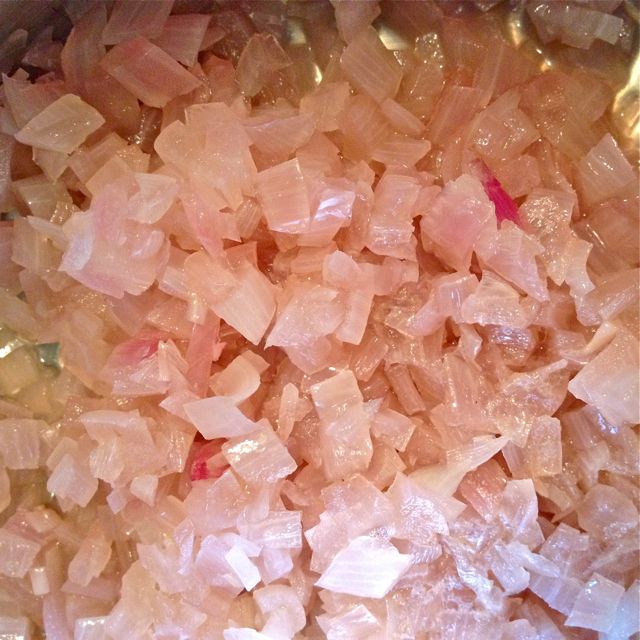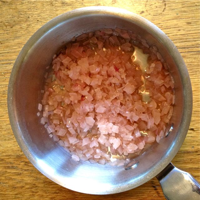 Reduce the heat, and simmer until the shallots are a lovely rosy uniform pink, and the liquids have reduced to about ¼” deep.