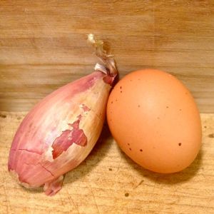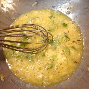 For this recipe, I was out of green onions, so used a shallot, and for the herb, I used some hardy Greek basil leaves, torn.