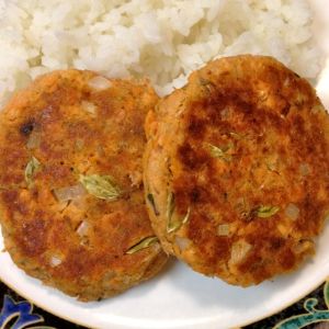 By now, if you put your rice on to cook first, it will be ready to serve with the salmon cakes.