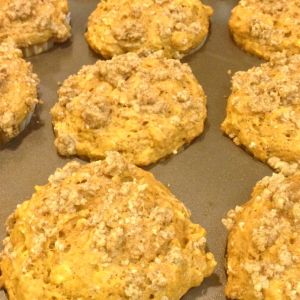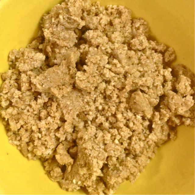 Mix together the flour, brown sugar, butter and reserved spice. Cut in the butter ‘til it resembles coarse meal. I use a mini processor.