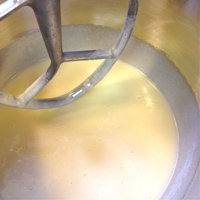 Next, fold in the milk and butter. The milk should be hot, don’t let it cool too much.