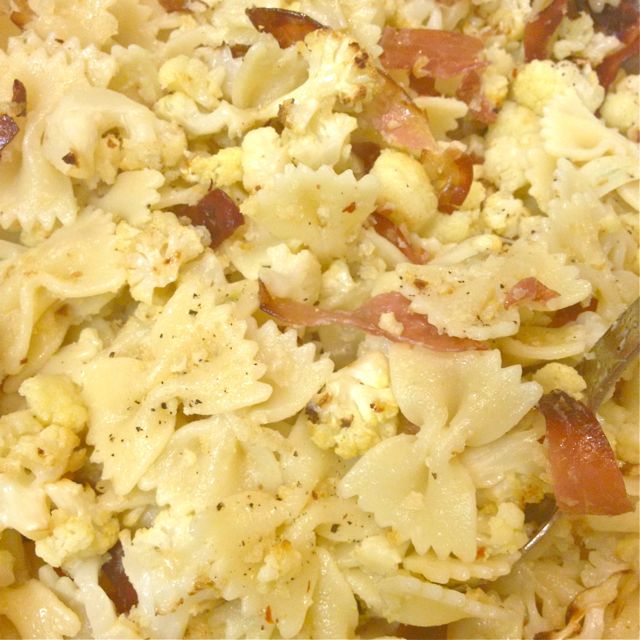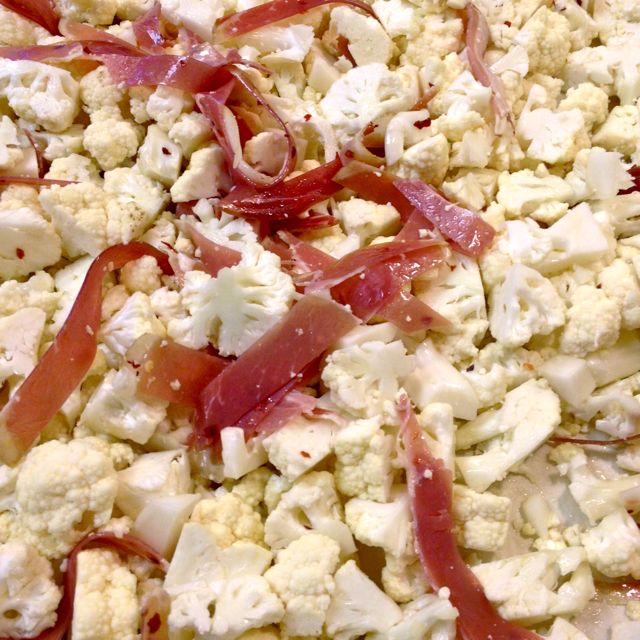In a large bowl, toss the cauliflower, prosciutto, chilies and 4 T of olive oil, and season lightly with salt & pepper.