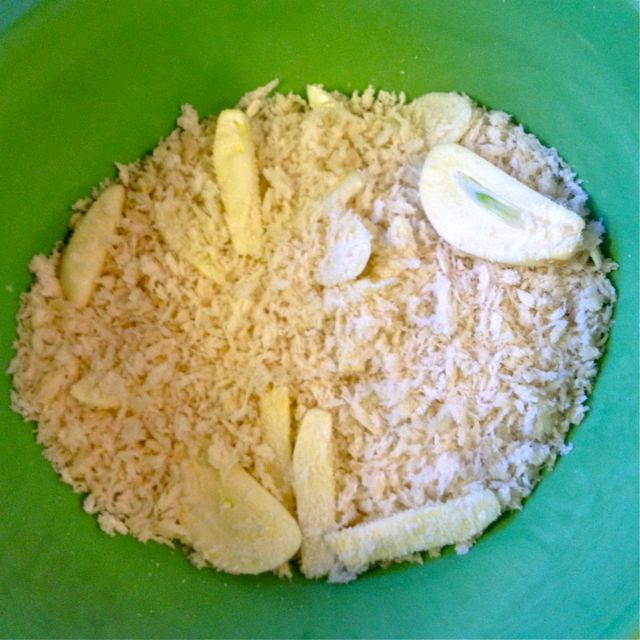 3 cloves of garlic, sliced very thinly, and tossed with the panko