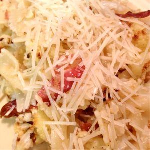 Cauliflower has never held much charm for me. A little lack lustre, usually served with some overpowering sauce of some sort. I do like it in Indian dishes, where it seems to have more strength, more depth. Then I tried roasting it. Wow. I love roasted cauliflower! Who knew that that’s all it needed? Here I serve it with pasta, a bit of crunch and a bit of spice. Using a whole cauliflower head, it makes a fair amount, but it always gets eaten.
