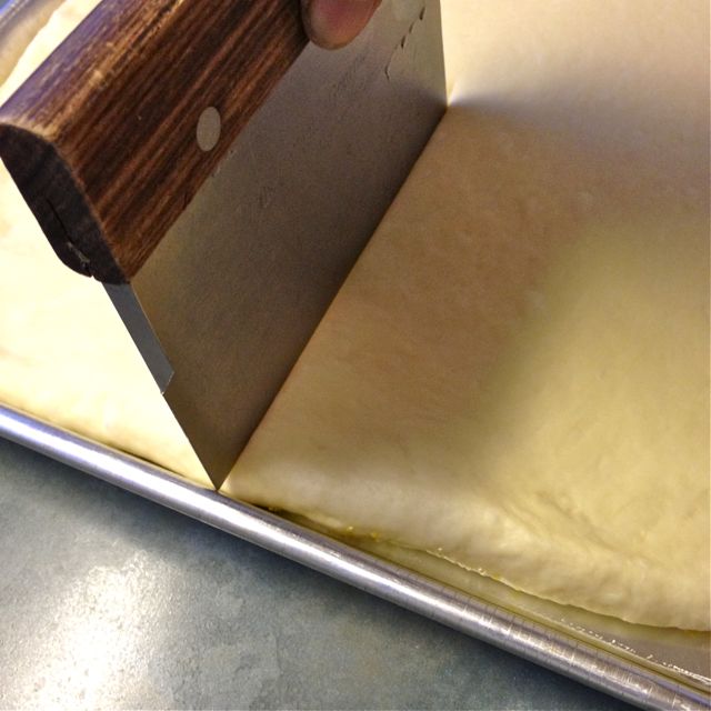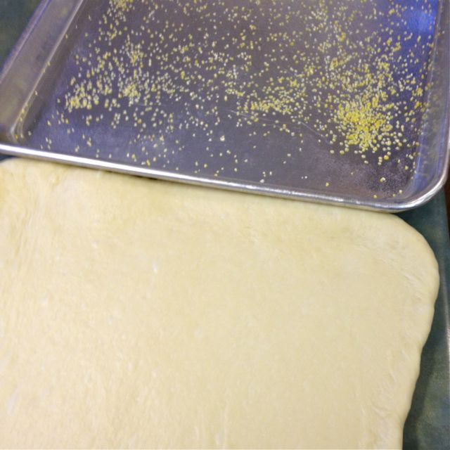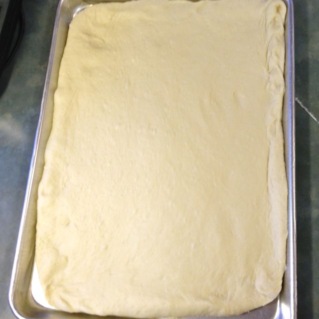Punch down; knead 10 or 12 times and roll out to fit ½ sheet pan (18 x 13).