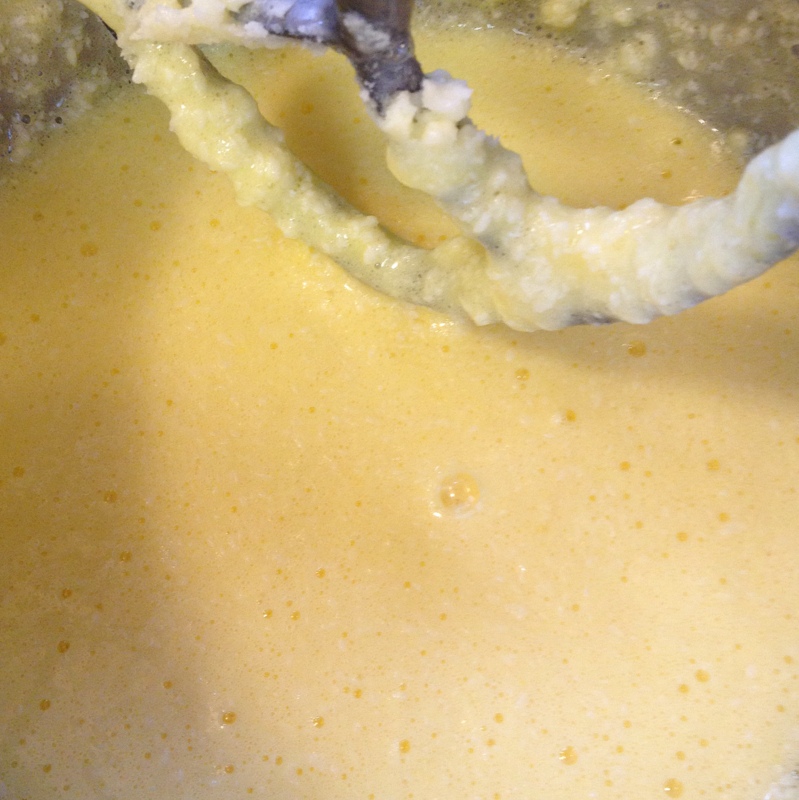 Add in the eggs, one at a time. Beat until each egg is fully incorporated, cleaning the sides of the bowl as you go. Crack all the eggs into a 2 c measure, pour gently and they’ll slide out one at a time, as needed.