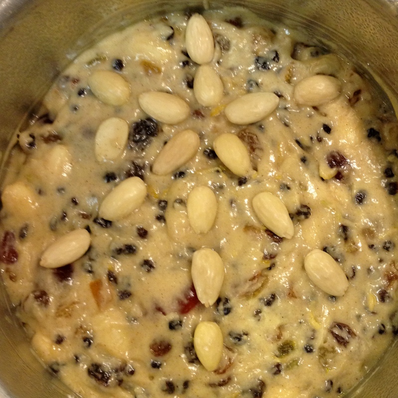 Add in the almonds, sultanas, raisins, currants, cherries, and peel.