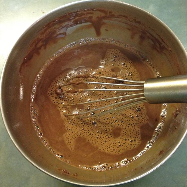 Pour the boiling water over it, and whisk gently to dissolve the cocoa and let sit to cool slightly.