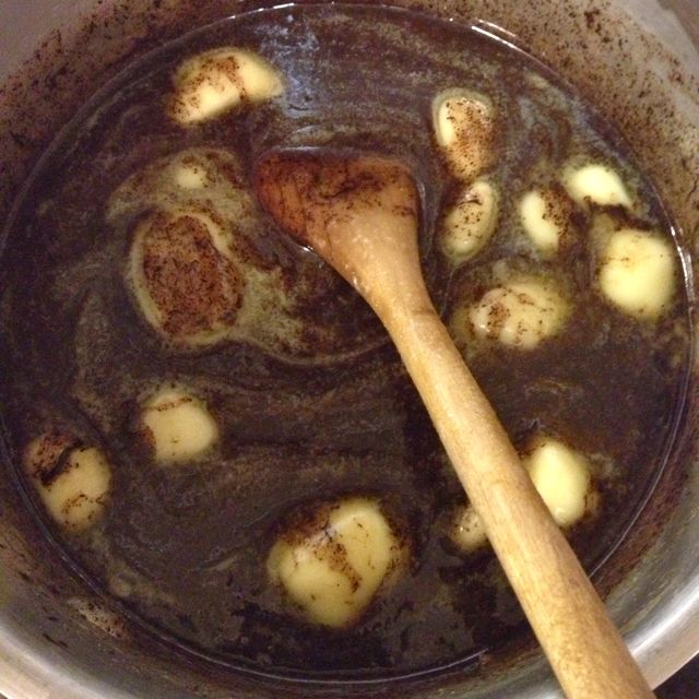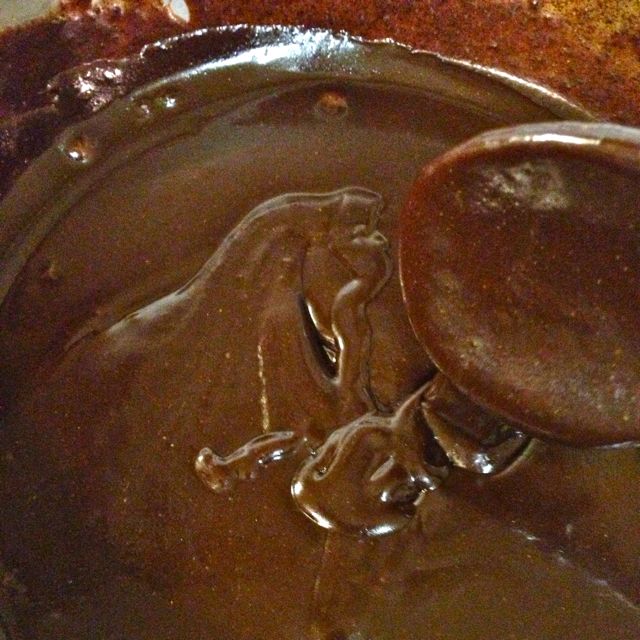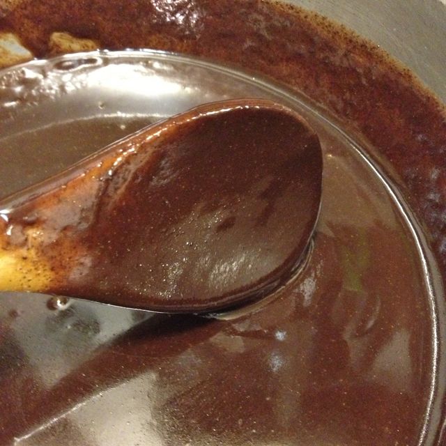Remove from the heat and stir in the chocolate, butter and vanilla. Stir until the mixture is uniform and all the chocolate and butter has melted.