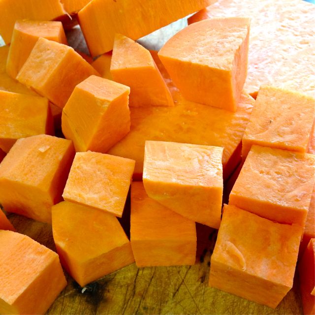 Cut the yam into 1” slices, peel and cut into uniform pieces