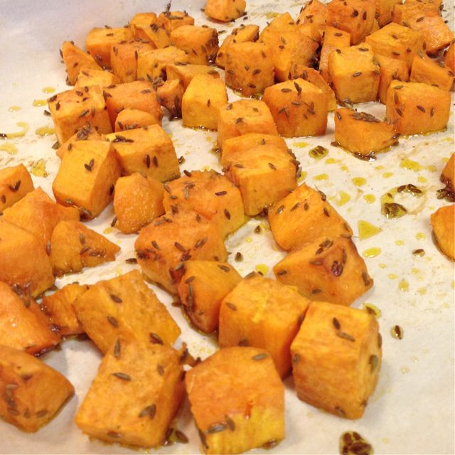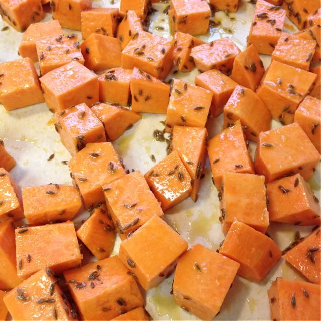 Put the yam pieces into a bowl, and drizzle with the two oils and sprinkle with the cumin seeds and salt.