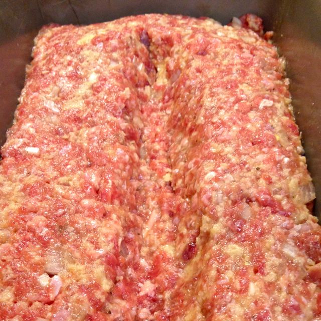 Form a trough down the center of the meatloaf, deep enough to hold all of the topping mixture. Be sure to leave a dam at each end.