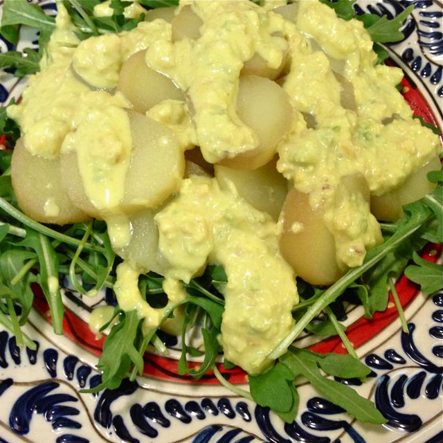 Spread the dressing over the potatoes. Alternatively, gently toss the slice potatoes before arranging them on the greens.
