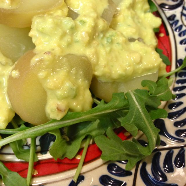 Peel and slice the potatoes into ¼” slices and arrange on the greens.