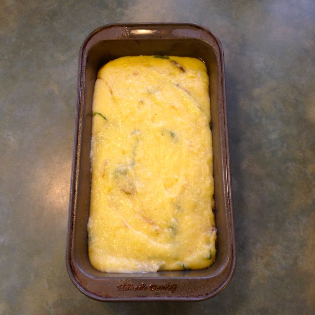 Spoon into a lightly greased 9” loaf pan or pie plate.