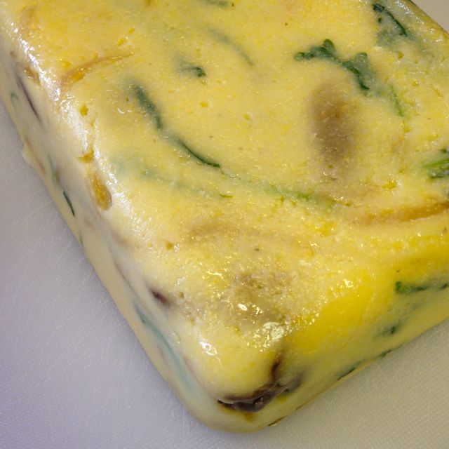 When chilled, remove the plastic wrap, tilt the loaf pan and gently release the polenta on to a cutting board. Cut into 1” slices, or if using a pie plate, cut into 6 wedges.