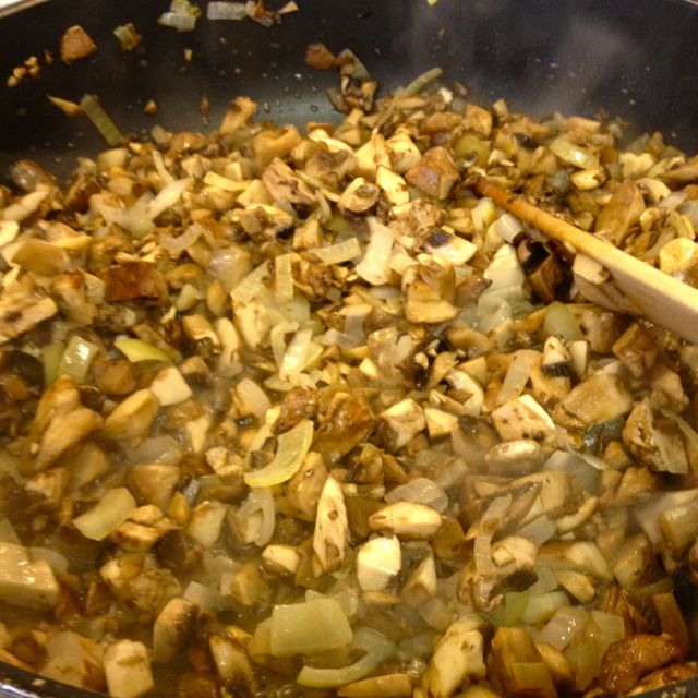 Add in the chopped mushrooms; continue to cook, stirring occasionally for about 10 minutes. They should weep and then the heat of the pan should dry them somewhat, turning everything a rich brown. Reduce the heat if this is happening too quickly.