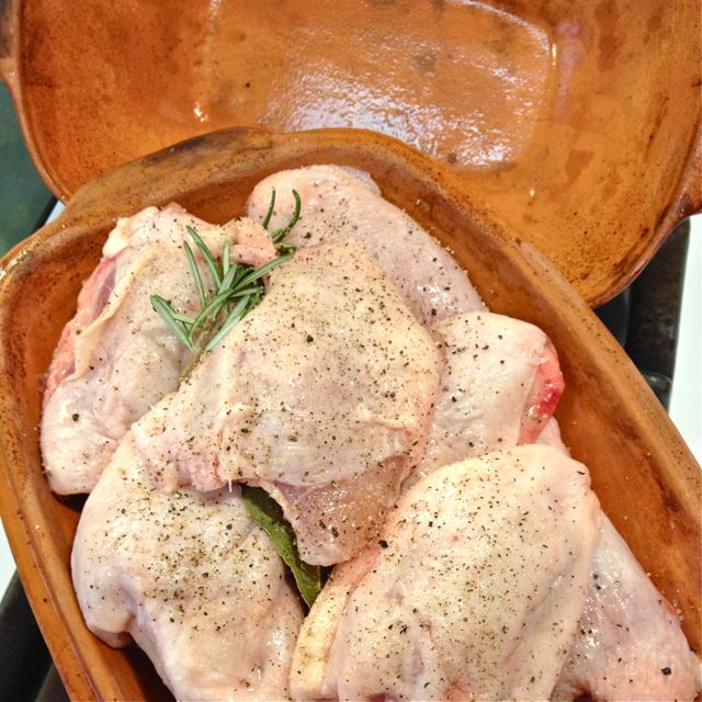 I would travel over every couple of weeks for a few island days away from my Vancouver life. One of my favourite meals was this chicken. It was never made from a store bought bird; always from a young rooster who’s destiny was in the pot. I still use the same clay baker – one is all you’ll need for the rest of your life, an incredible investment.