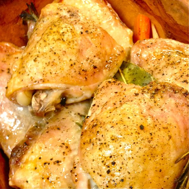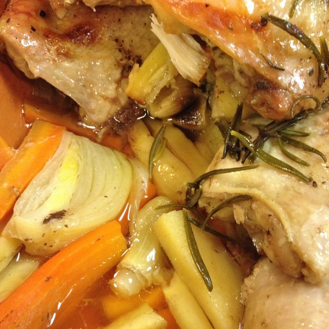 Arrange the chicken pieces on top of the vegetables, imbedding the bay leaf & rosemary within.