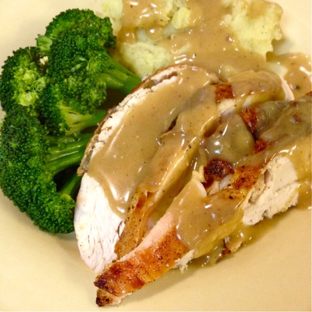 Whisk an equal amount of flour, as you have drippings, into the drippings in the pan over medium heat. When the flour is completely absorbed, and is a smooth roux (it’s okay if there’s yummy bits in it), start to add in warmed chicken stock. Continue to add in stock, stirring while the gravy thickens. A nice addition is white wine, but only to about ¼ of your liquid. You may use a couple of cups of liquid total, or if you’re lucky you may have enough drippings to make more.
