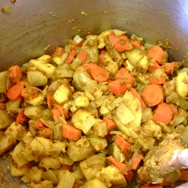 Add in the curry powder and stir to distribute through all, for about a minute.