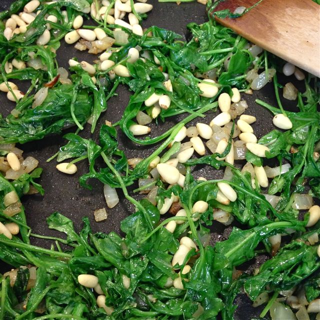 Add in the arugula; cook, stirring, until wilted and no moisture remains, about 3 minutes.