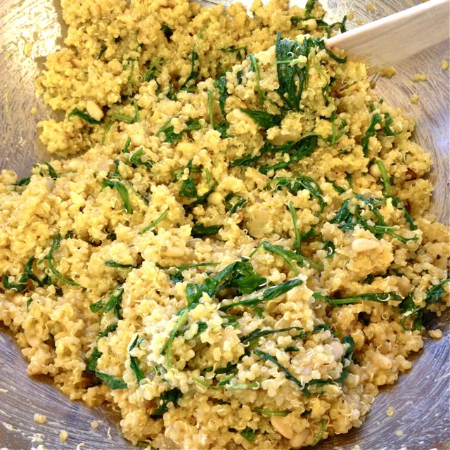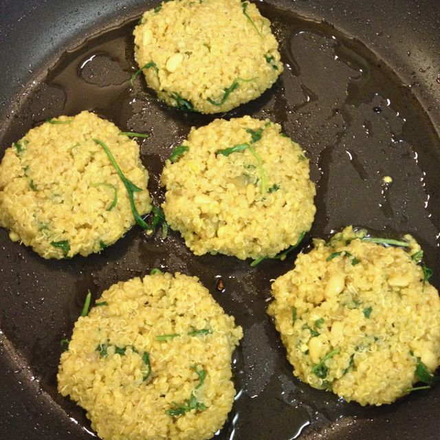 Fold in quinoa and arugula mixture. With wet hands, form into about 16 cakes; transfer to a parchment lined tray.