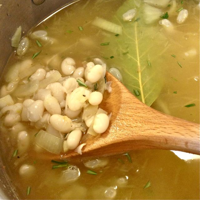 In a large soup pot, place the pre-soaked beans, stock, rosemary and bay leaves.
