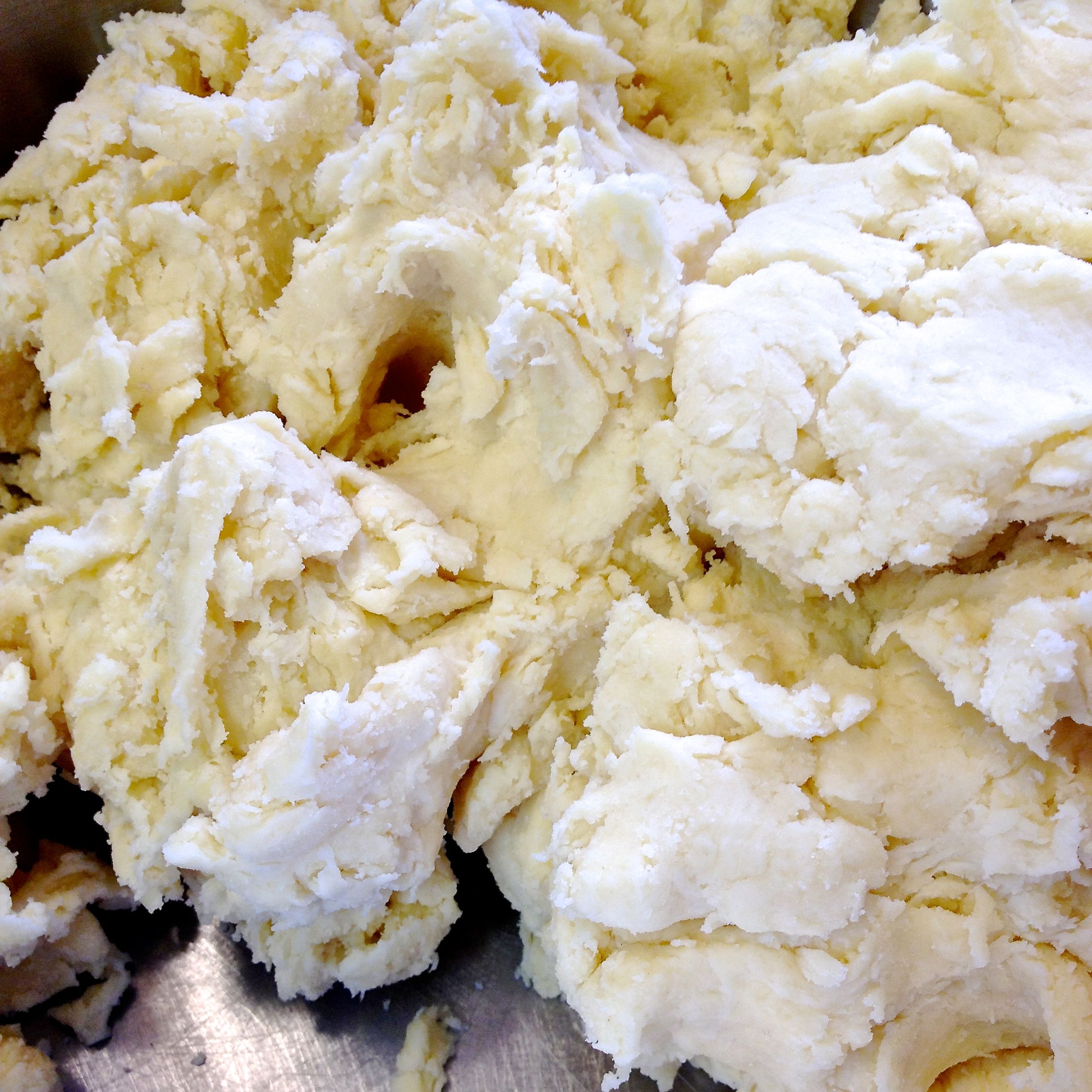 Using a pastry blender cut the fats into the dry ingredients. You can also use two knives, or your fingers (but only if you have cold hands!) The largest pieces of fat should be no larger than a pea.