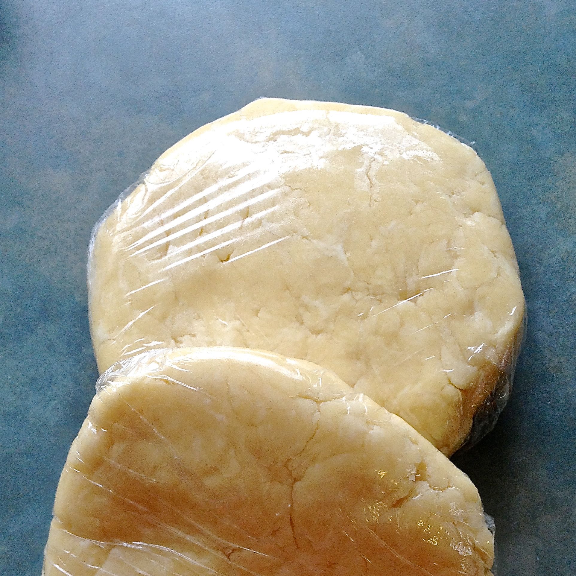 Once you have a ball of loosely mixed dough, break it into two pieces, and form into discs about an inch thick. Cover with plastic wrap and set in the fridge for an hour or up to a day.