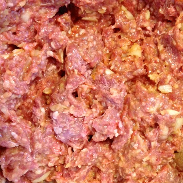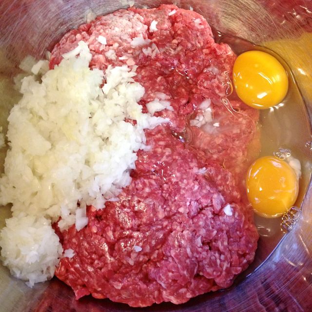 In a large bowl mix the ground beef with the two eggs & the minced onion.