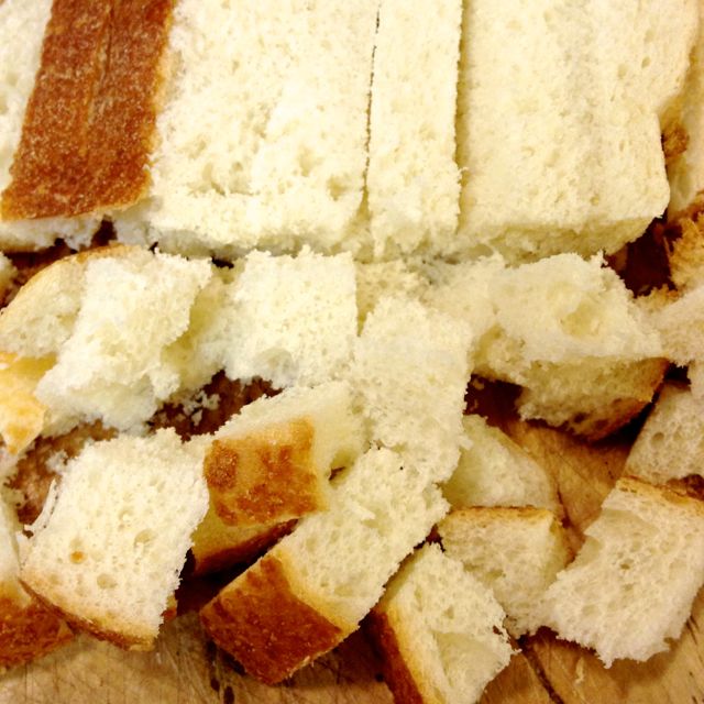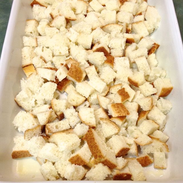 Cut the bread, crust on, into ½” cubes. If the loaf is unsliced, it is easiest to slice it first, and then cube the slices.