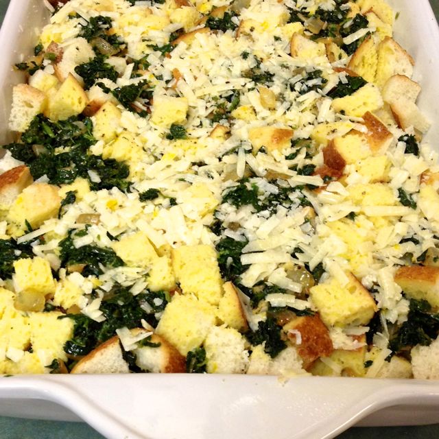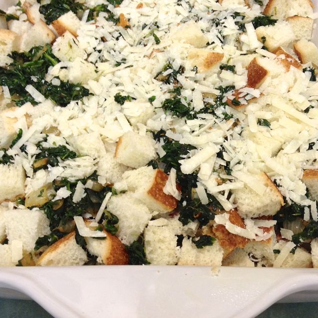 Sprinkle half the spinach mixture evenly over the bread cubes.