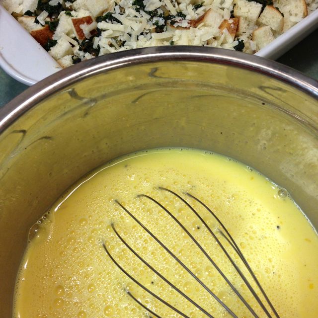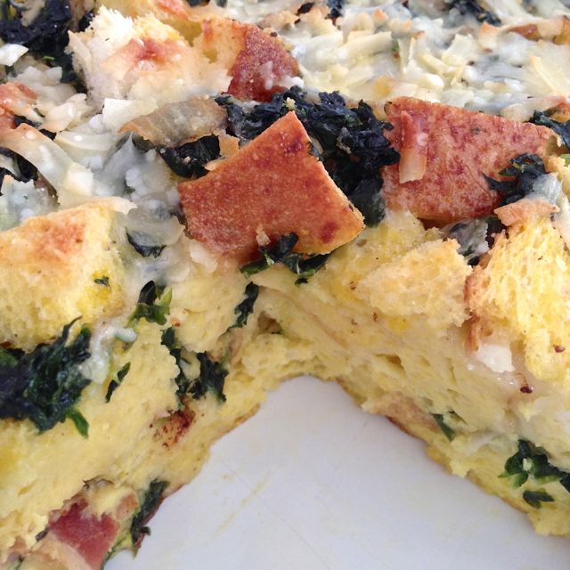 Bake the strata at 350° for 40 minutes until a sharp knife testing the center comes away clean. You don’t want to over bake it, as creaminess is essential to a good bread pudding, which is essentially what you’re making.