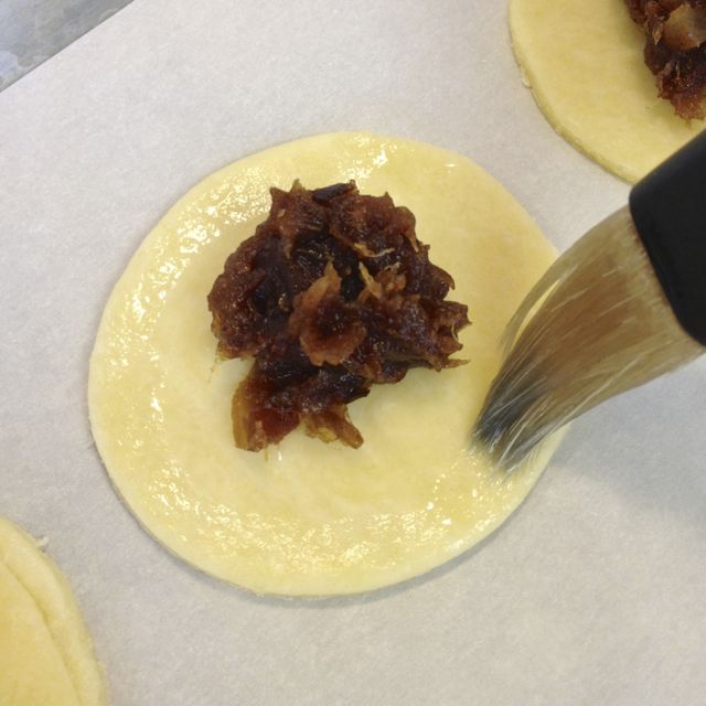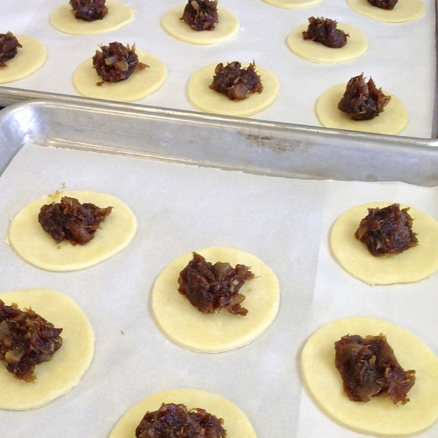 Evenly spoon about a teaspoon of the filling into the center of each round. Use one teaspoon to scoop and another to push off onto the pastry round, using up the filling.
