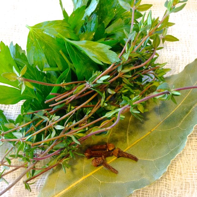 Lay out the cheesecloth, and group the herbs & cloves on it. Tie it up with a bit of kitchen string.