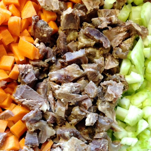 Pull away as much meat as you can from the bones, discarding any obvious bits of fat and gristle along with the bones.