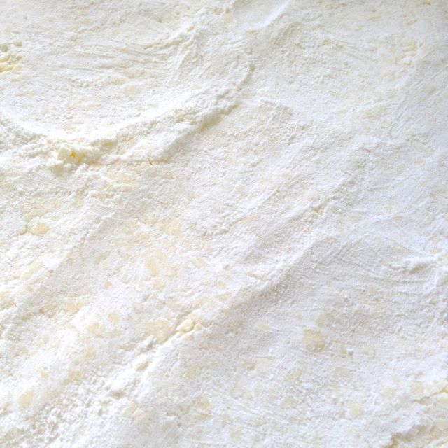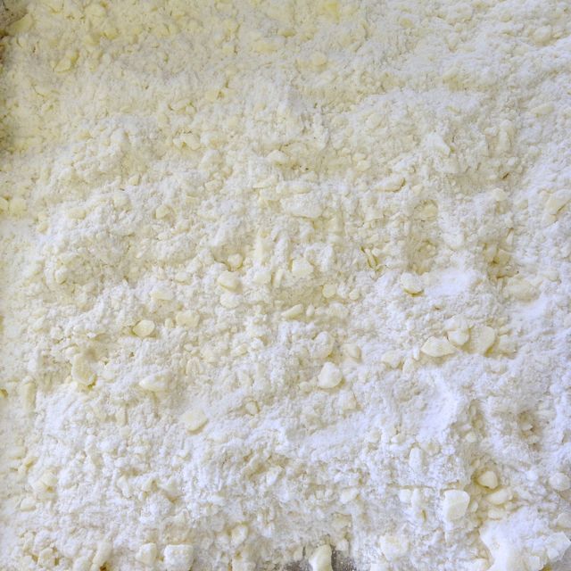Pulse the crust ingredients in a processor until no piece of butter is larger than a pea.  Or do it in the pan, as Sheila does, and break the butter into the flour with your fingers (no need to grease the pan either way).