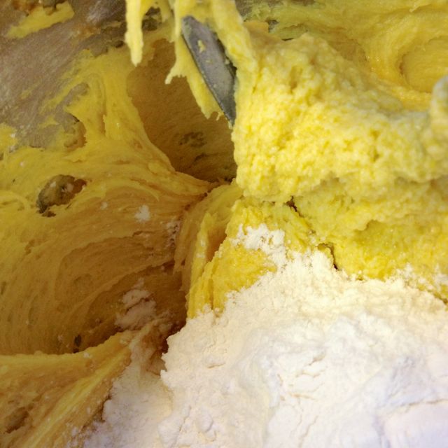 With the mixer on a lower speed, add in the dry ingredients in four additions. Making sure each addition is well mixed before adding in the next.