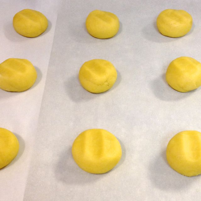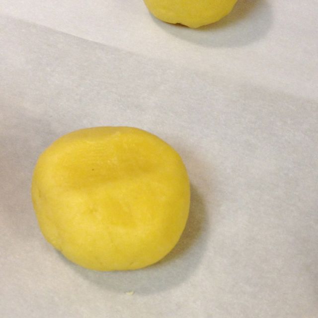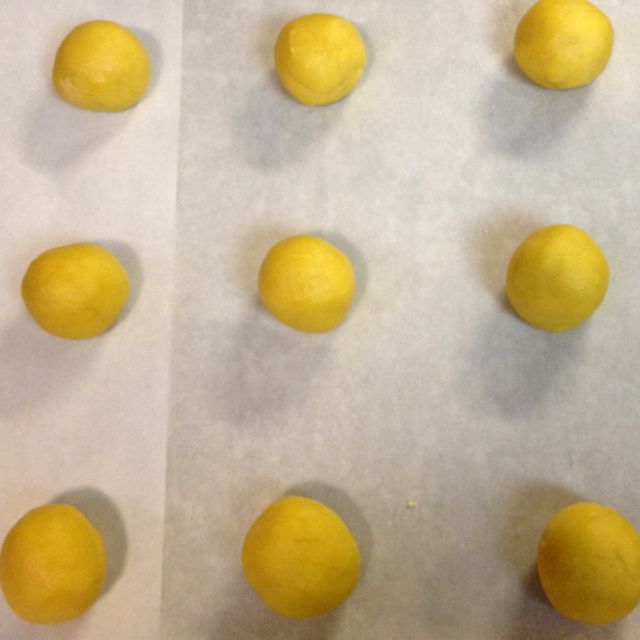 Using about ⅛ of a cup (2 Tablespoons, or 30 grams, or 1 ounce) of dough at a time, roll the dough into balls.
