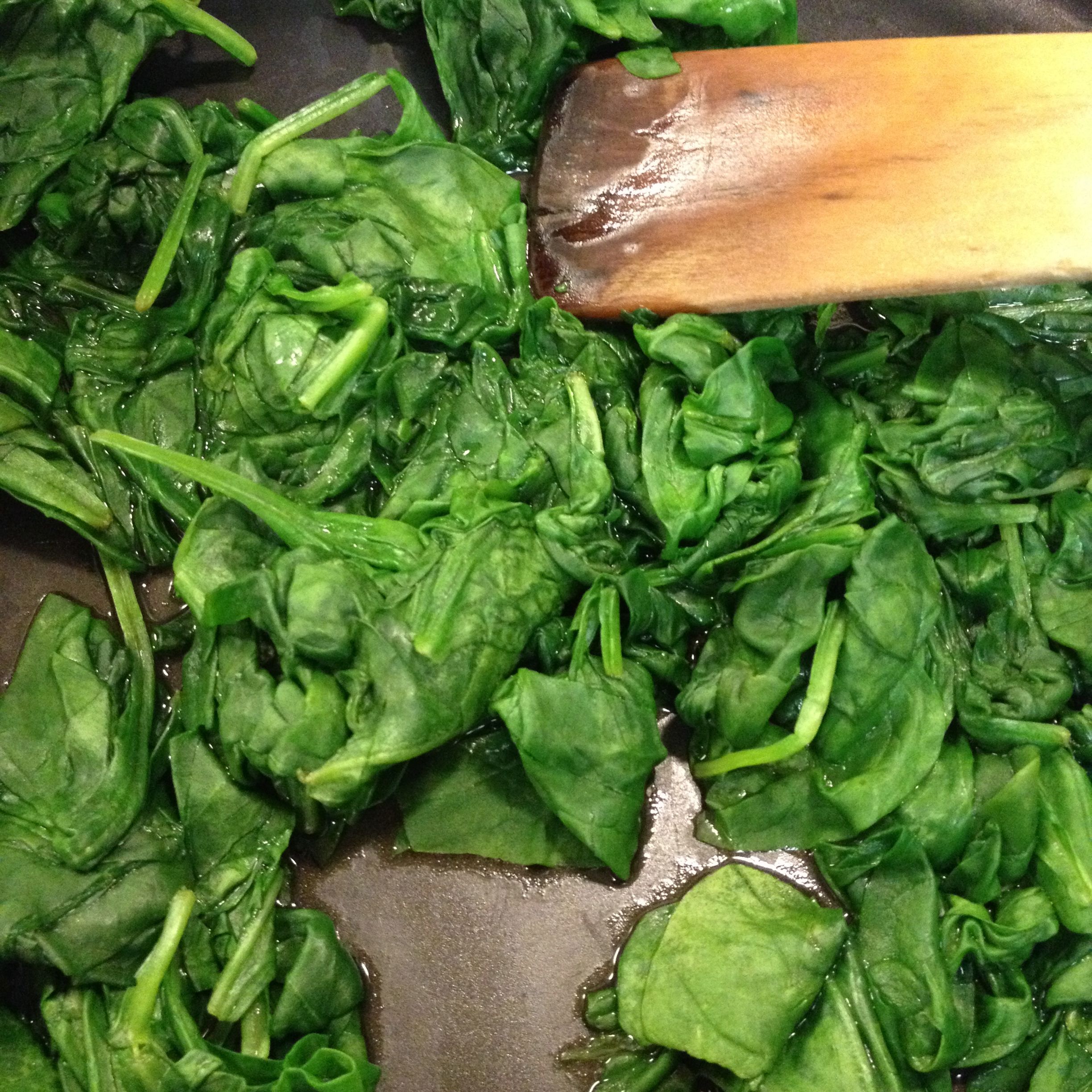 In a deep skillet, without adding any extra water, cook the spinach over medium heat until just wilted.