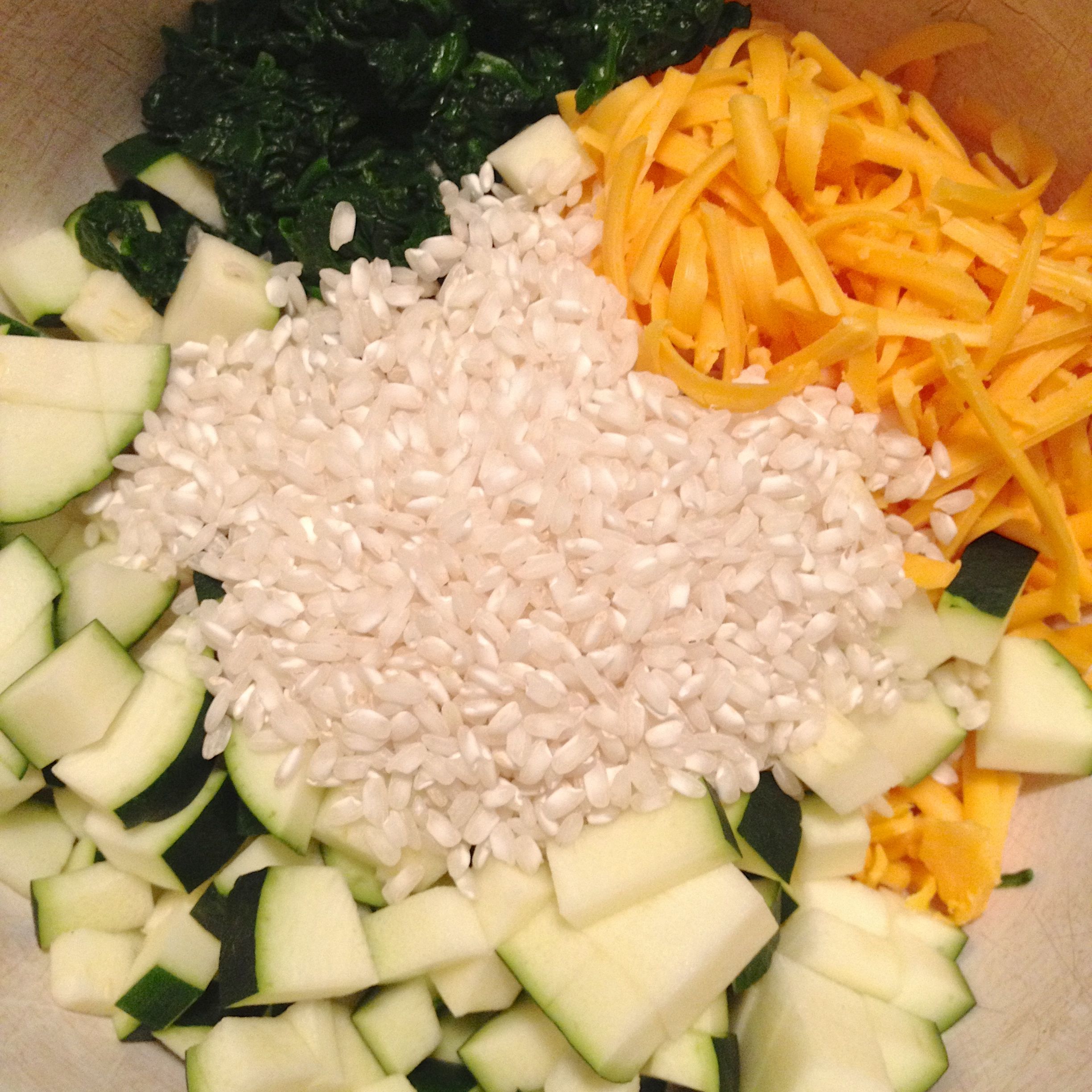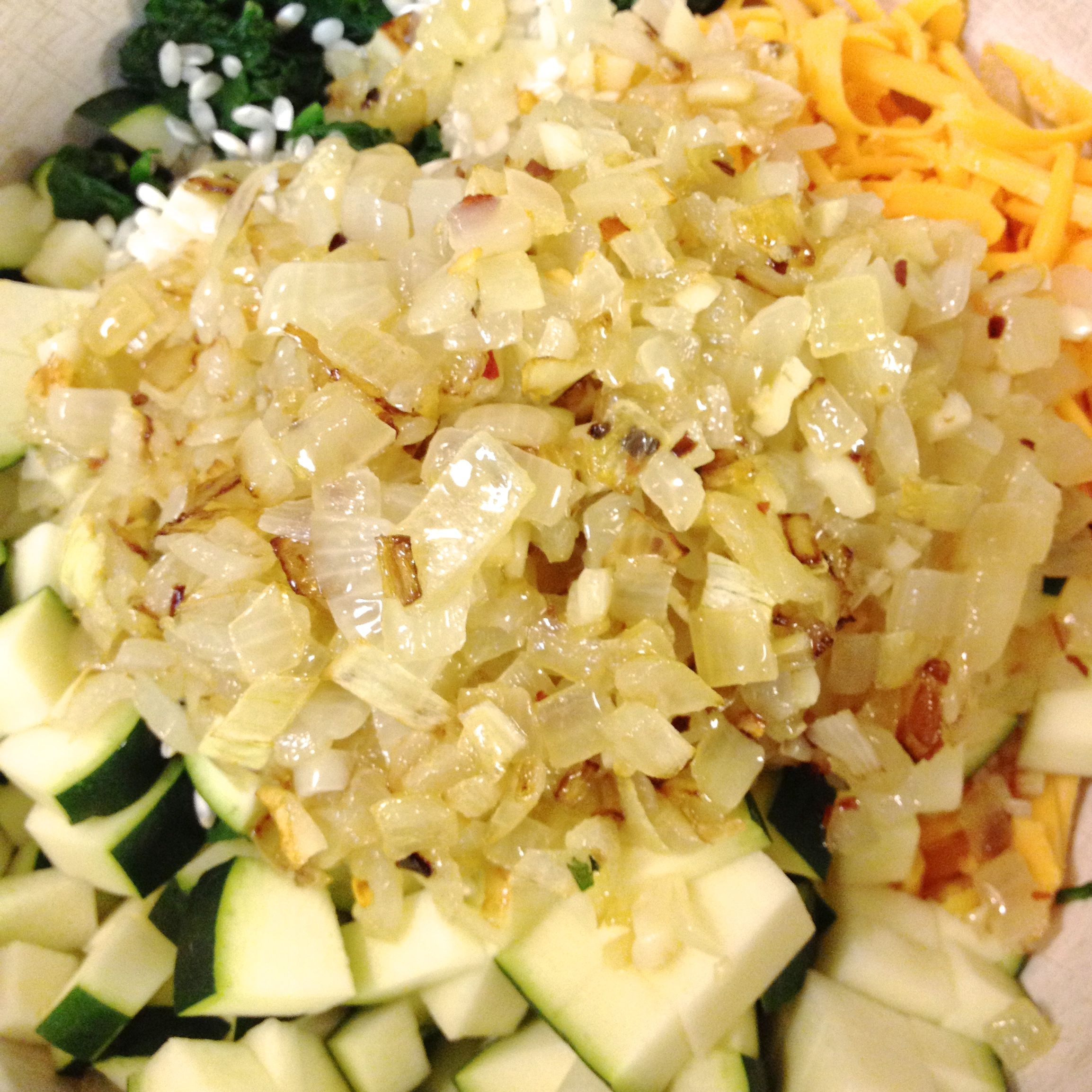 Into a large bowl, add the chopped spinach, zucchini, cheddar, rice, salt, pepper, and cooled onion mixture.