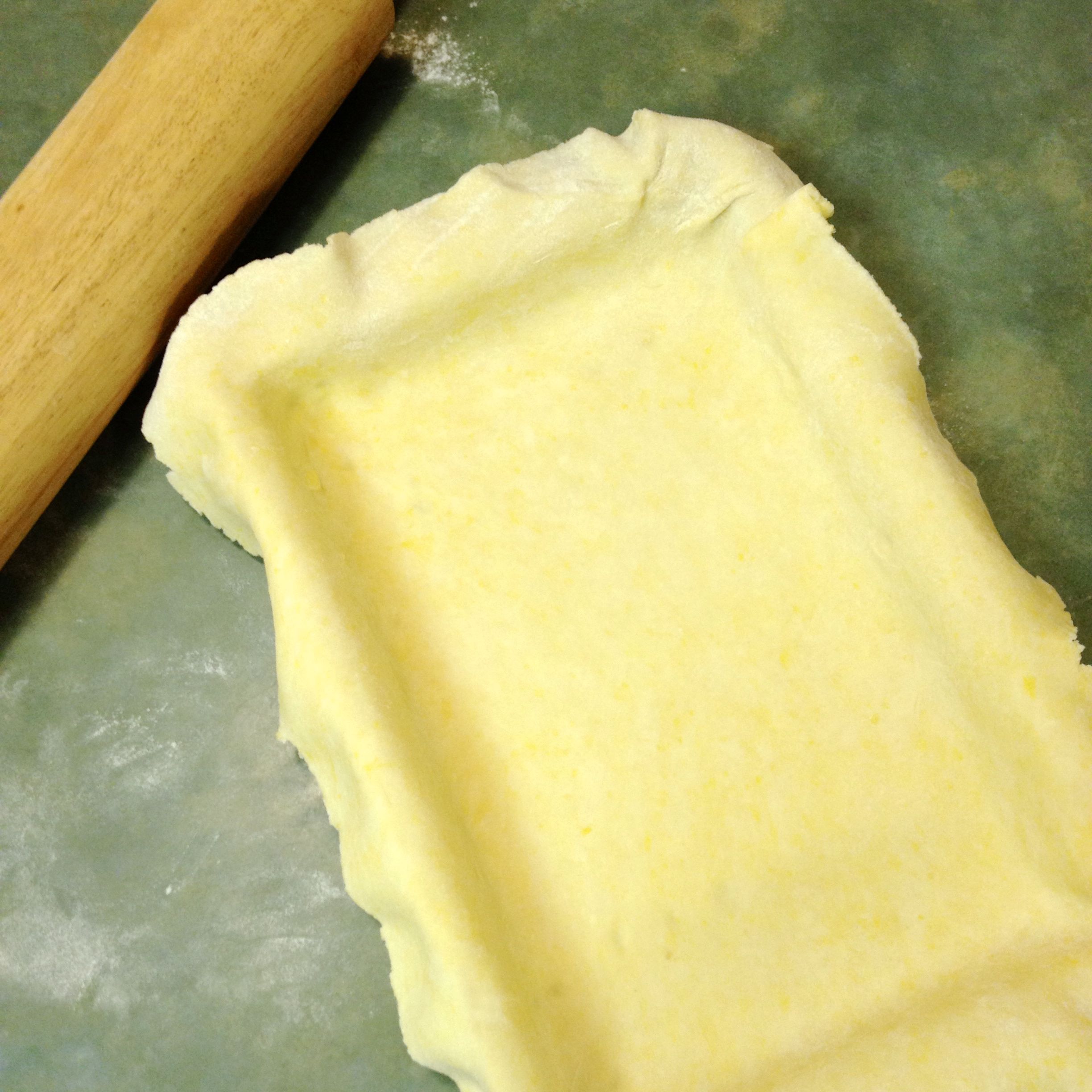 Using one disc of dough, roll it out on a lightly floured surface, big enough to easily cover the pan, with overhang.