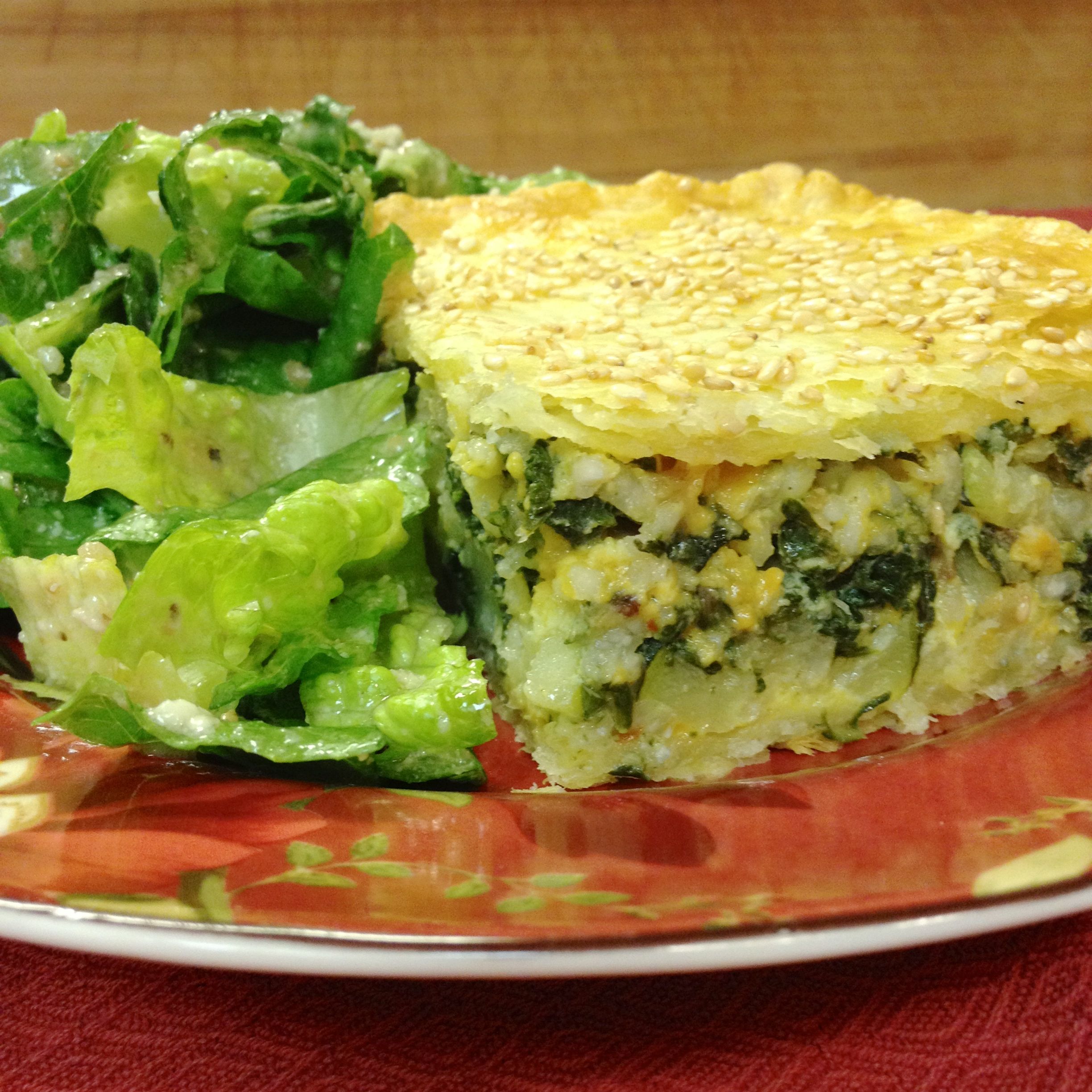 Mom used to make a cheese noodle pie that was so incredibly good, but when looked at through today’s lenses, makes me think that perhaps it was a little too good, too much starch, and too much fat. It was a great pie to take along to a potluck, a lunch en route, or for a weekend family dinner. This recipe appeals to me for exactly the reasons that I loved Mom’s pie. Everything is in it, just add a salad or some raw vegetables, and we’re good to go.