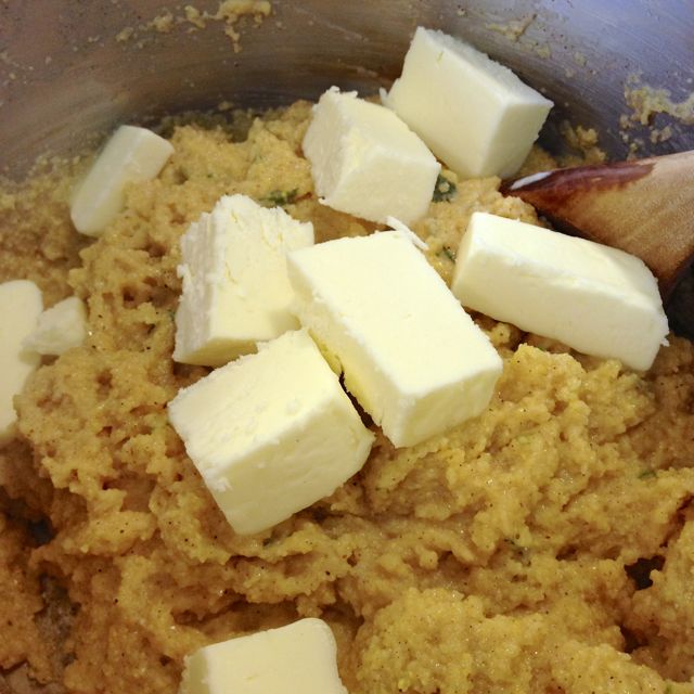 Once the mixture has been tempered, you can add in the remainder of the cooked cornmeal in about three additions.