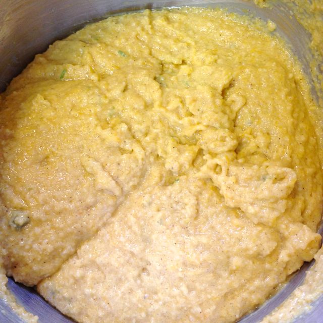 While the mixer is running, add in a few spoonfuls of the cooked cornmeal to the egg & squash mixture.